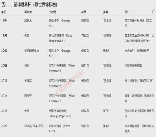 教主做了两个表格:自1992年至今,美国男篮历届奥运会和世界杯的主教练。老K教练无疑是最大赢家,率领美国男篮夺得三届奥运会金牌和两届篮球世界杯金牌。唯一的失利是2006年男篮世界杯,半决赛不敌希腊,最终夺得第三名。