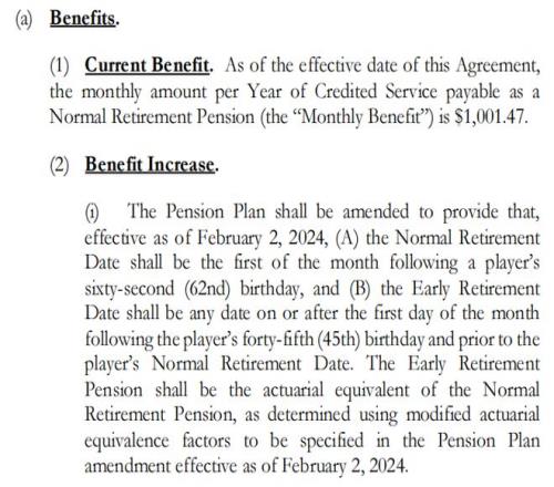具体而言,当球员在62岁以上“正常退休”时,每月可领取1001.47美元×效力年限的全额退休金。此外,球员可选择在45岁生日次月的第一天及之后、正常退休日期之前的任意日期退休领取养老金,领取的金额需按照规定的精算系数递减。