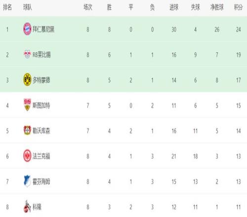 在积分榜上,拜仁独一档的存在,以24分排名榜首。莱比锡紧随其后,6胜1平1负的战绩,拿到19分,只比拜仁少5个积分。第3的是多特蒙德。多特蒙德5胜2平1负,拿到17分。斯图加特以15分排名第4。第5的是勒沃库森,只拿到14分。本赛季的勒沃库森很难威胁到拜仁的地位。法兰克福和霍芬海姆都是13个积分。